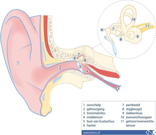 Geluid is een trilling. De oorschelp vangt deze trilling op en geeft hem door aan de gehoorgang. In de gehoorgang bevindt zich het trommelvlies. Het trommelvlies begint te trillen en geeft zo het geluid door aan het middenoor. In het middenoor zitten de gehoorbeentjes: hamer, aambeeld en stijgbeugel. Deze gehoorbeentjes komen in beweging en geven de trilling door aan het binnenoor. Het binnenoor bestaat uit het slakkenhuis en het evenwichtsorgaan. Het slakkenhuis is een soort buisje dat opgerold is in de vorm van een slakkenhuis. In dit buisje zit vloeistof die door de trilling van de stijgbeugel ook in trilling wordt gebracht. Door het trillen van de vloeistof worden vervolgens haarcellen, die zich in de wand van het slakkenhuis bevinden, geprikkeld. De haarcellen prikkelen op hun beurt de gehoorzenuw. Via de gehoorzenuw worden signalen doorgegeven aan die gedeelten van de hersenen waar gewaarwording van geluid en spraak / taal plaatsvindt.